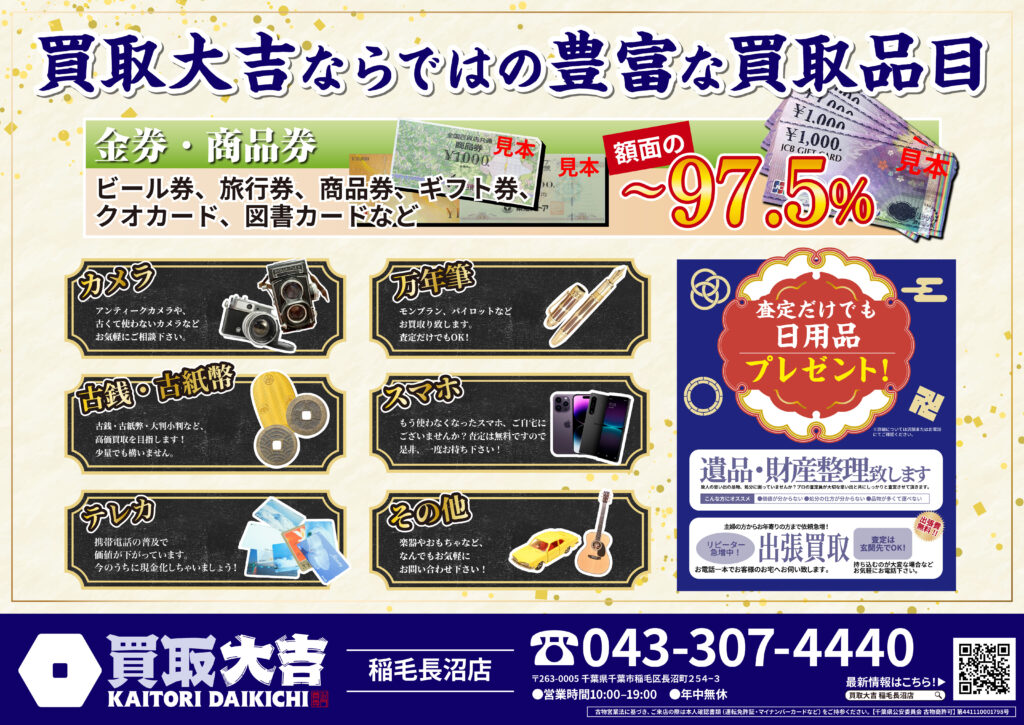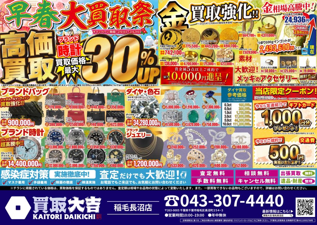 キャンペーン実施店舗 よくあるご質問 買取価格は主にどんな要素から決まるのでしょうか? お品物の状態や付属品の有無、最新相場、流通量などによって買取価格を算出します。 どんなものを買い取ってもらえますか? 金・貴金属・ブランド品はもちろん、お値段がつくか迷われているものも是非お持ちください。 傷や汚れのあるアイテムでも買取可能ですか? 大歓迎です。未使用品などのお持ち込みは少なく、傷や汚れのあるアイテムをお持ちいただく方が半数以上です。状態の悪いお品物やカビなどがあってもお買取可能なケースもございます。 どんな情報があればすぐに査定額を教えてもらえますか? お品物の名前や種類、状態、またはブランド名、型番などの情報があると、概ねの査定額をお伝えできるかと思います。 店舗での査定時間はどのくらいですか? お品物の種類や個数にもよりますが、約5分から30分ほどの査定時間となるケースが多いです。事前にある程度の査定時間をお伝えいたしますので、ご安心ください。